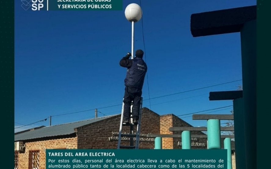 28/07/2025 | Por estos días, personal del área eléctrica lleva a cabo el mantenimiento de alumbrado público tanto de la localidad cabecera como de las 5 localidades del interior, se realiza el refuerzo lumínico en la pista de atletismo, reparaciones en plaza "Falucho", Playón polideportivo "San Roque" y mantenimiento en las diferentes dependencias municipales.