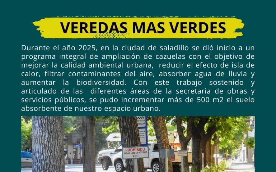 13/02/2026 | Durante el año 2025, en la ciudad de saladillo se dió inicio a un programa integral de ampliación de cazuelas con el objetivo de mejorar la calidad ambiental urbana, reducir el efecto de isla de calor, filtrar contaminantes del aire, absorber agua de lluvia y aumentar la biodiversidad.