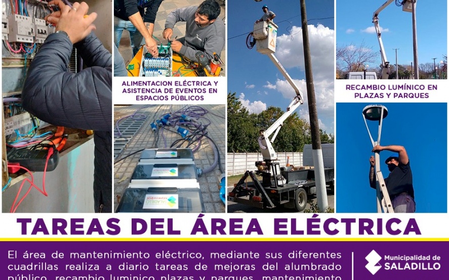 24 05 2023 | El área de mantenimiento eléctrico, mediante sus diferentes cuadrillas realiza a diario tareas de mejoras del alumbrado público, recambio lumínico plazas y parques, mantenimiento de dependencias municipales, colaboración mediante trabajos de grúa a distintas instituciones y asistencia a diversos eventos entre otros.