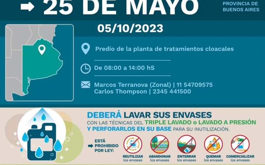 25 de Mayo: El 5 de Octubre recepcionarán envases vacíos de fitosanitarios