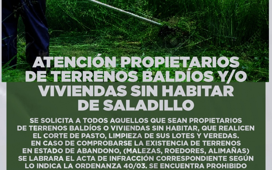 Atención propietarios de terrenos baldíos y/o viviendas sin habitar de Saladillo