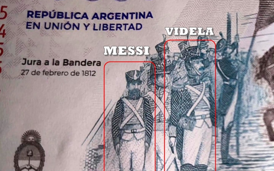 El billete de 10.000 pesos está en circulación desde hace muy poco tiempo. Ya llamó la atención en su momento por su diseño y por la aparición de papeles falsos. Pero ahora, usuarios de redes sociales creyeron ver otra cosa en ellos… y se generó la polémica. Porque si en el anverso del billete están María Remedios del Valle y a Manuel Belgrano, en el reverso se representa la primera Jura de la Bandera, del 27 de febrero de 1812. Entre los soldados que aparecen, hay quien dice ver nada menos que al astro futbolístico Lionel Messi y al expresidente de facto Jorge Rafael Videla.
