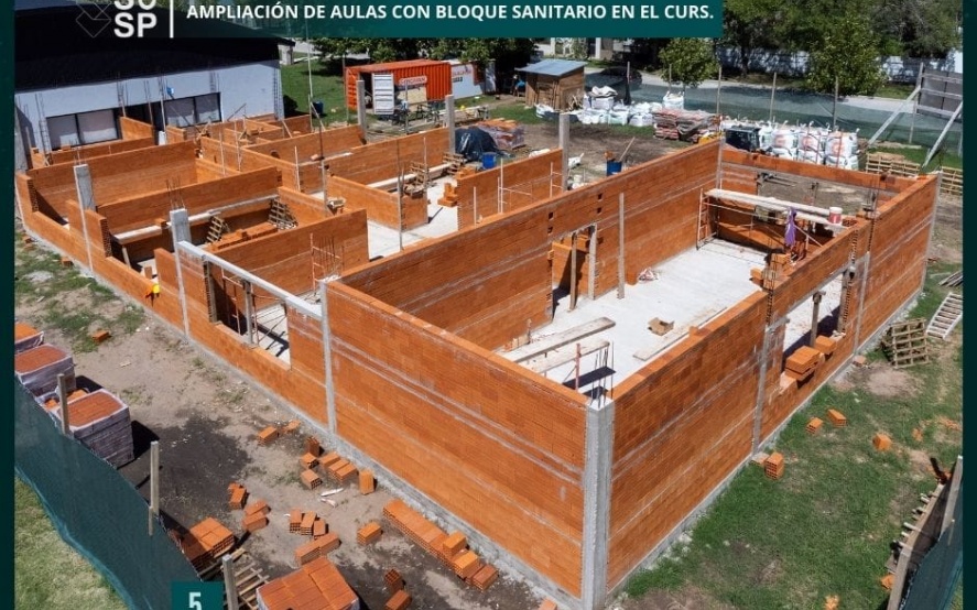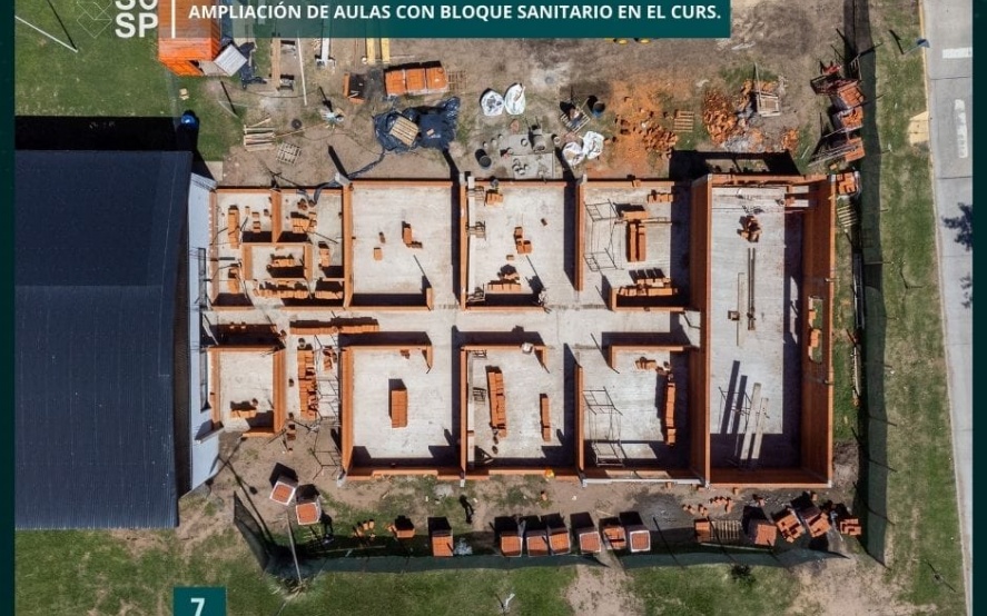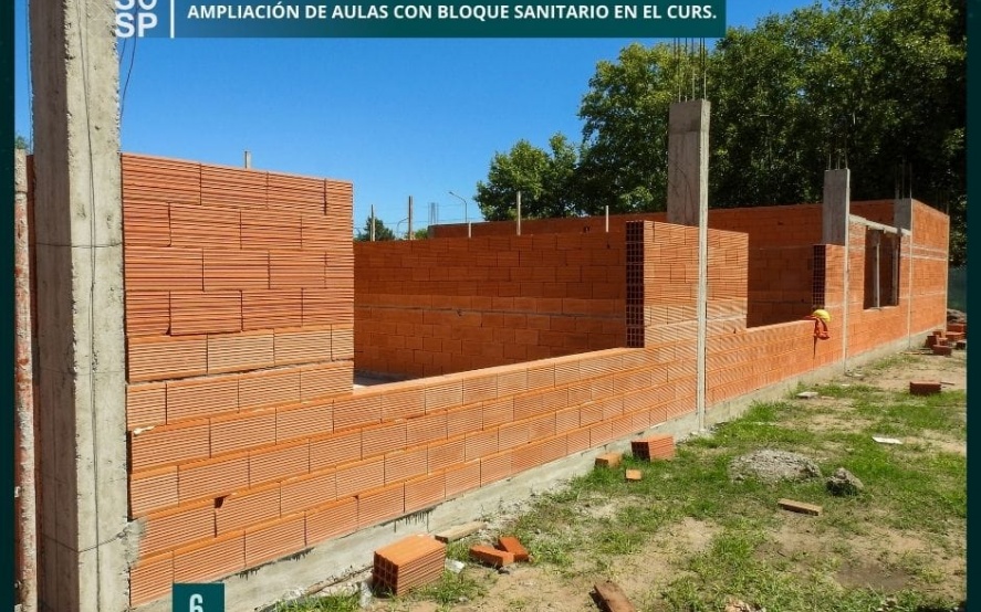 Esta obra, afrontada íntegramente con fondo educativo municipal, forma parte de las intervenciones que se vienen ejecutando en dicho edificio. Con un avance del 30% se realizan muros de elevación y vigas de encadenado superior. Se estima quede finalizada para mediados del corriente año.