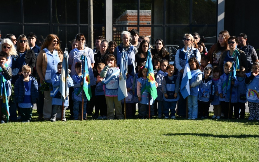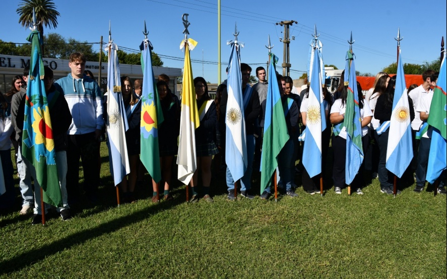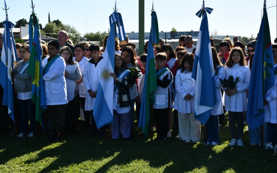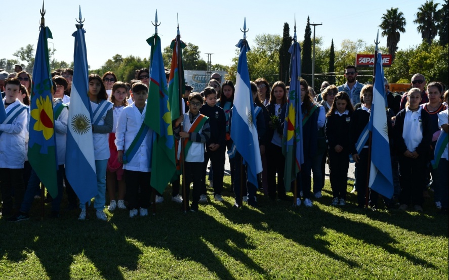 Luego del ingreso de las banderas de ceremonia de los establecimientos educativos se entonaron las estrofas del Himno Nacional Argentino para dar lugar luego a las palabras del sacerdote Padre Francisco Molfesa y colocar ramos de laureles por parte de todos los presentes.