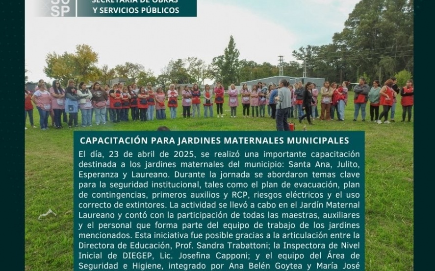 25/04/2025 | En el día, 23 de abril de 2025, se realizó una importante capacitación destinada a los jardines maternales del municipio: Santa Ana, Julito, Esperanza y Laureano.