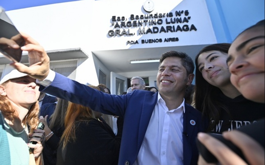 El gobernador de la provincia de Buenos Aires, Axel Kicillof, encabezó el acto de inauguración formal del nuevo edificio de la Escuela de Educación Secundaria N°5 de General Madariaga, junto al director general de Cultura y Educación, Alberto Sileoni; el intendente local, Esteban Santoro; y la directora de la institución, Gabriela Kopciuch. Además, entregó patrulleros y firmó un convenio para financiar obras de infraestructura social y urbana en el barrio Belgrano.