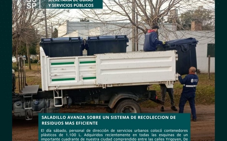 Adquiridos recientemente en todas las esquinas de un importante cuadrante de nuestra ciudad comprendido entre las calles Yrigoyen, De Santibañez, Alem y Buteler. Estos 100 nuevos contenedores se suman a los 170 existentes ubicados en los barrios Pro.Cre.Ar, Esperanza, plan familia propietaria y la totalidad de la localidad de Saladillo Norte.