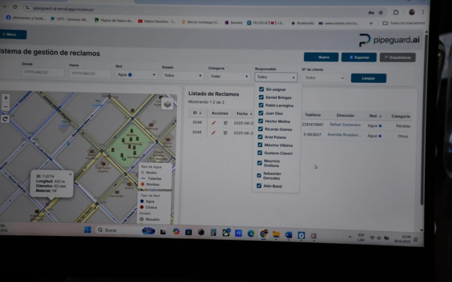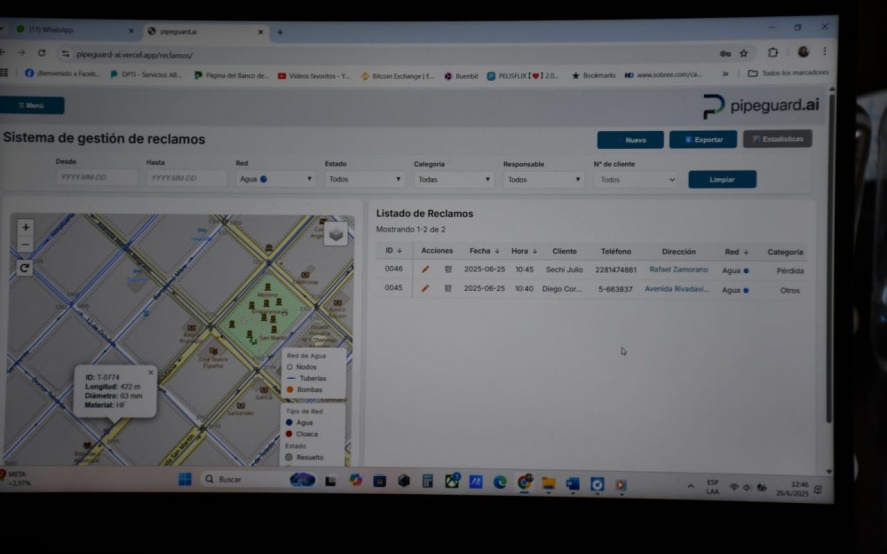 Desde la Subsecretaría de Servicio Sanitarios y Gestión Ambiental y a través de la plataforma Pipeguard desarrollada por Juan Martín Marsenaro se está implementando un nuevo sistema de gestión de reclamos para el servicio de agua y cloacas.